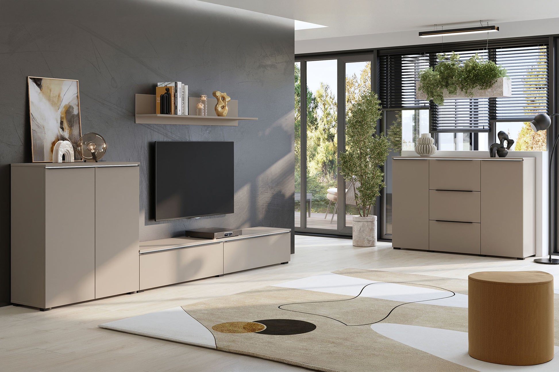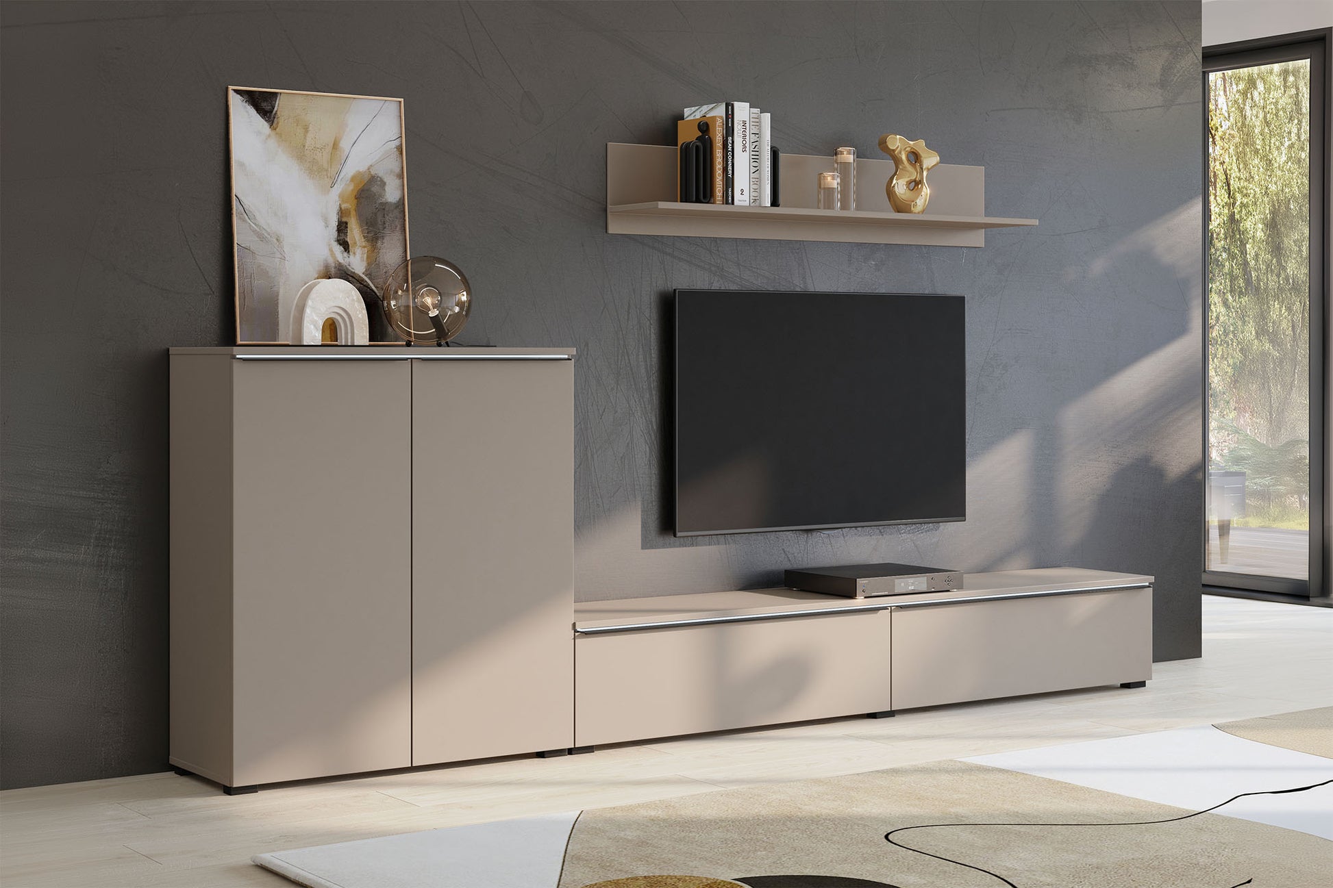Tanos sienas skapis ir īsts multivides centrs, kas pārdomāti un funkcionāli organizē dzīvojamās istabas telpu.