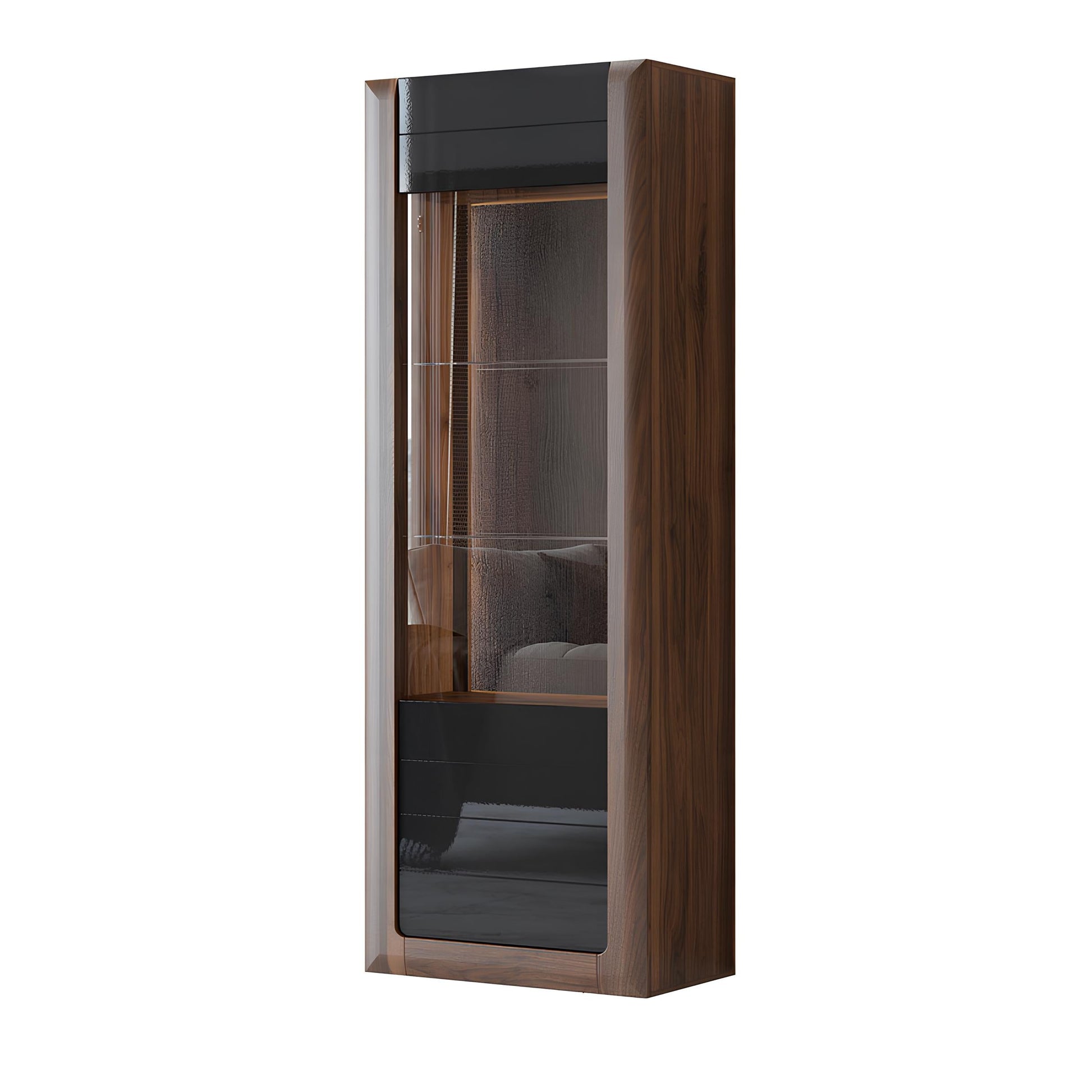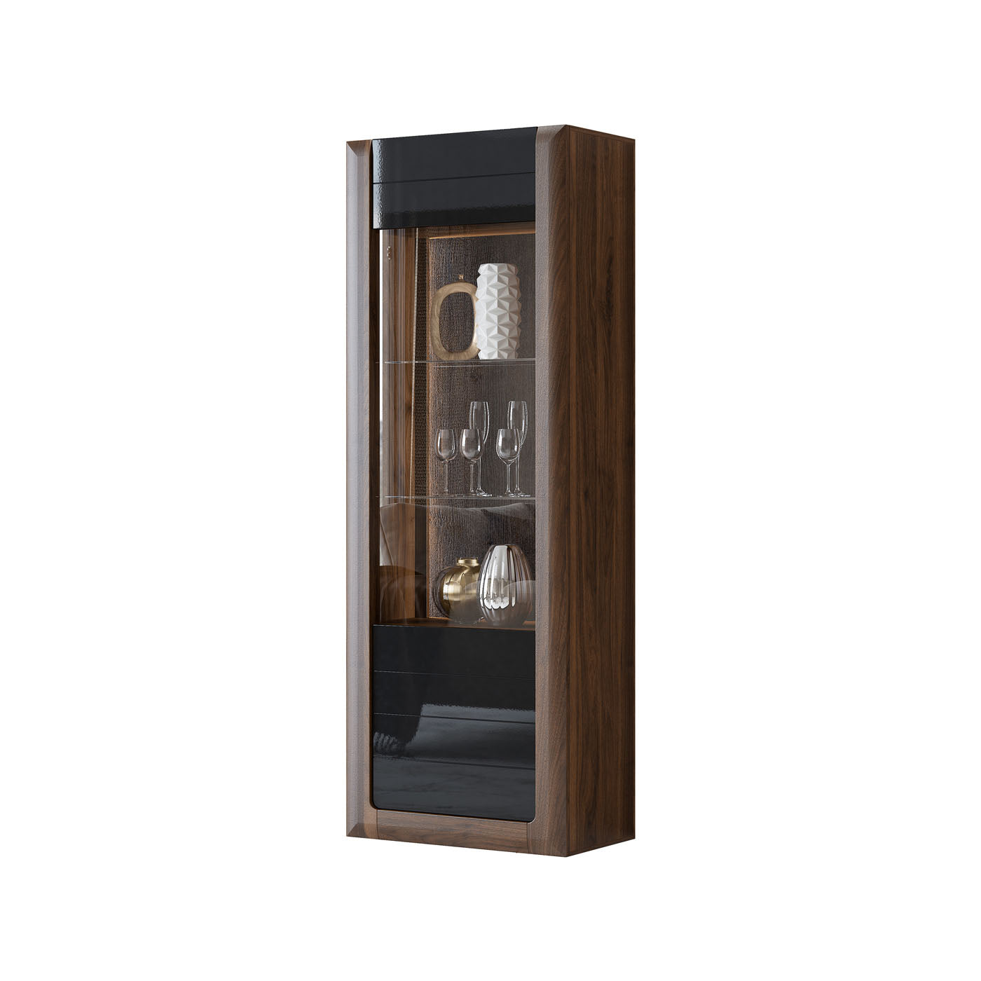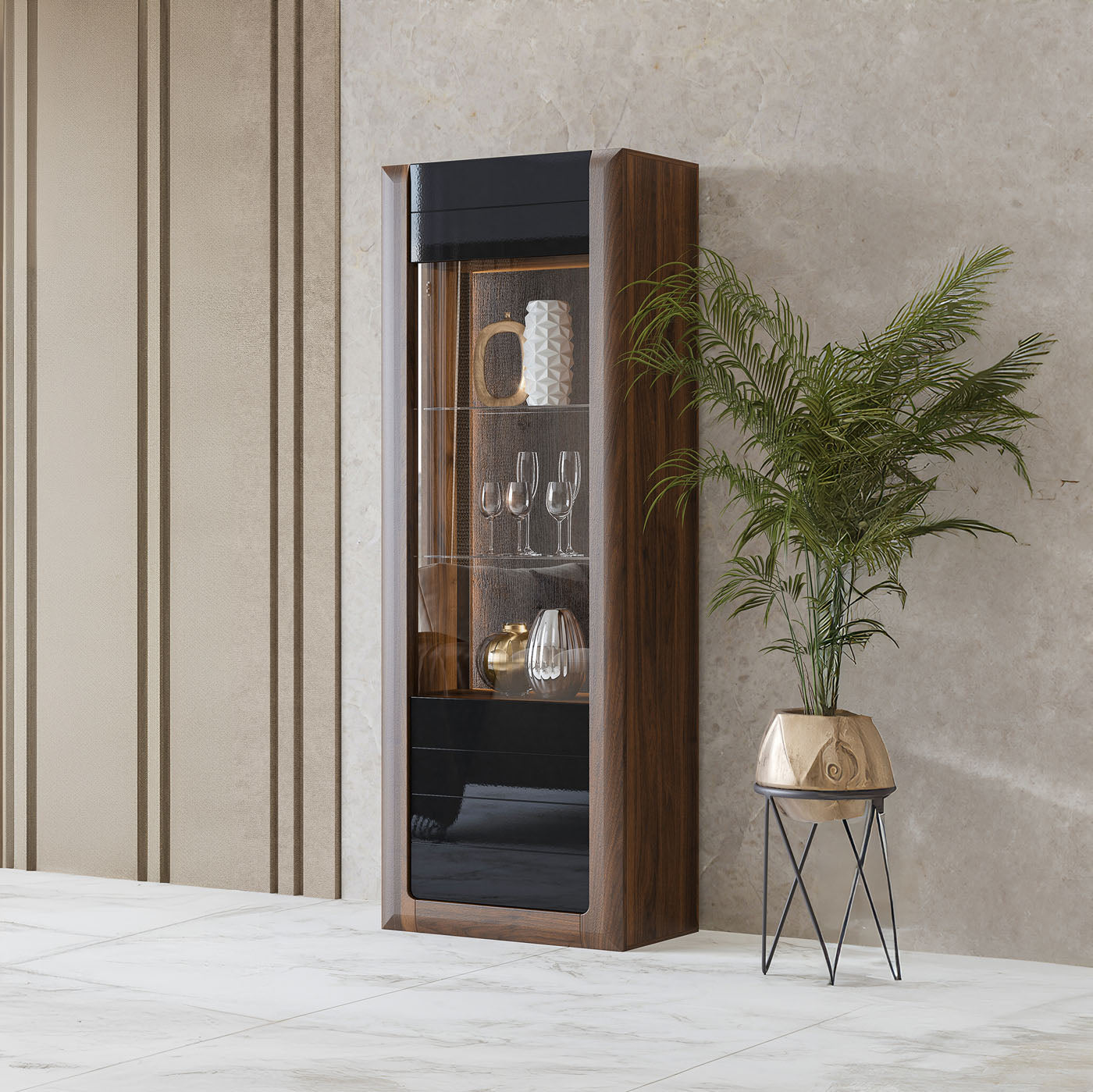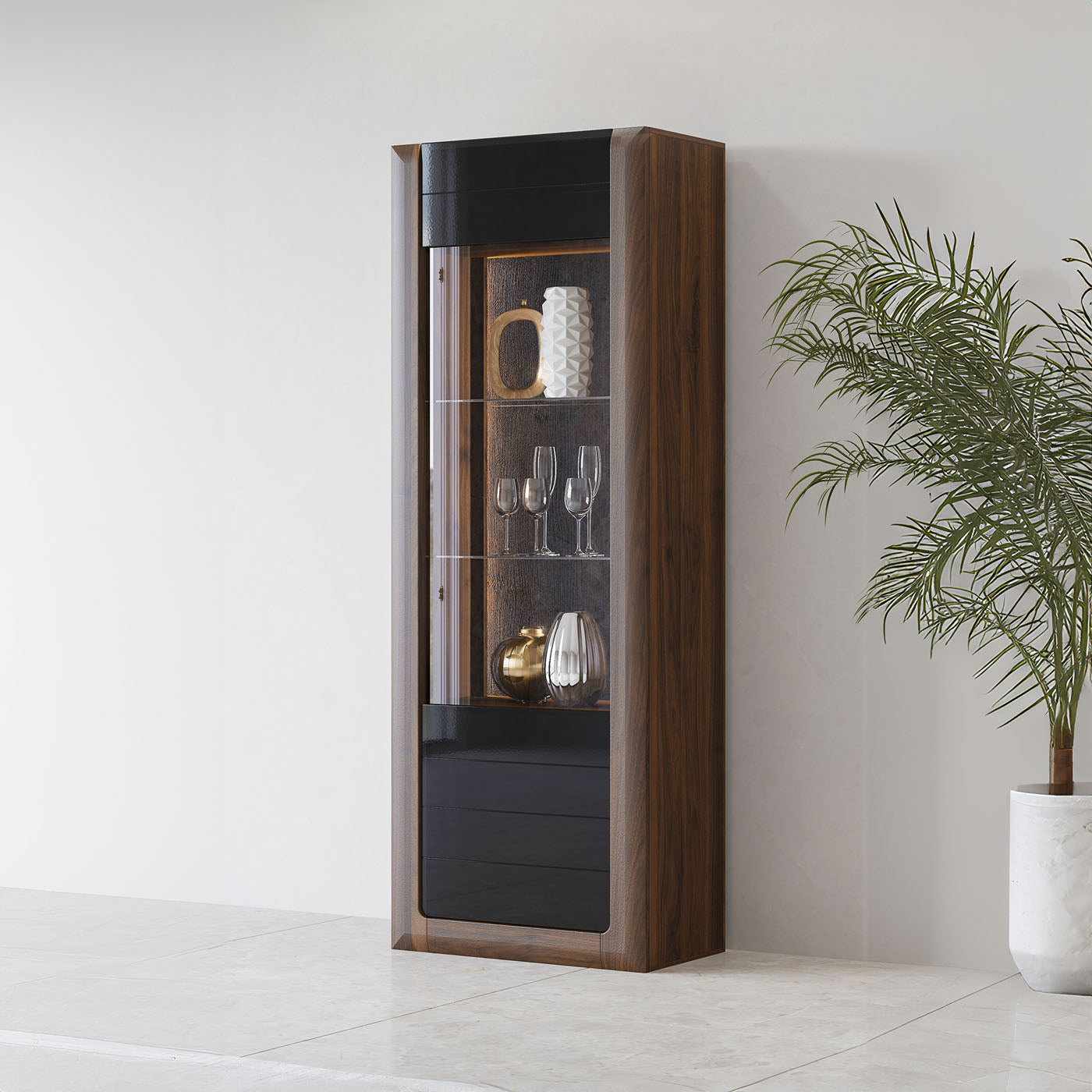 Vitrīnu skapīšu durvis ir izgatavotas no rūdīta stikla, piešķirot elegantu, modernu pieskārienu, vienlaikus uzlabojot mēbeļu drošību un izturību.