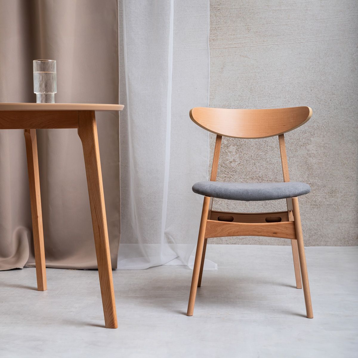 Materiāls Krēsls ir izgatavots no augstas kvalitātes dižskābarža koka, nodrošinot izturību un stabilitāti. Polsterētais pelēkais sēdeklis ir ne tikai estētiski pievilcīgs, bet arī ērts un viegli tīrāms, padarot to par ideālu izvēli ikdienas lietošanai. Papildinformācija Svars: 5,25 kg Augstums no zemes līdz sēdeklim: 45 cm