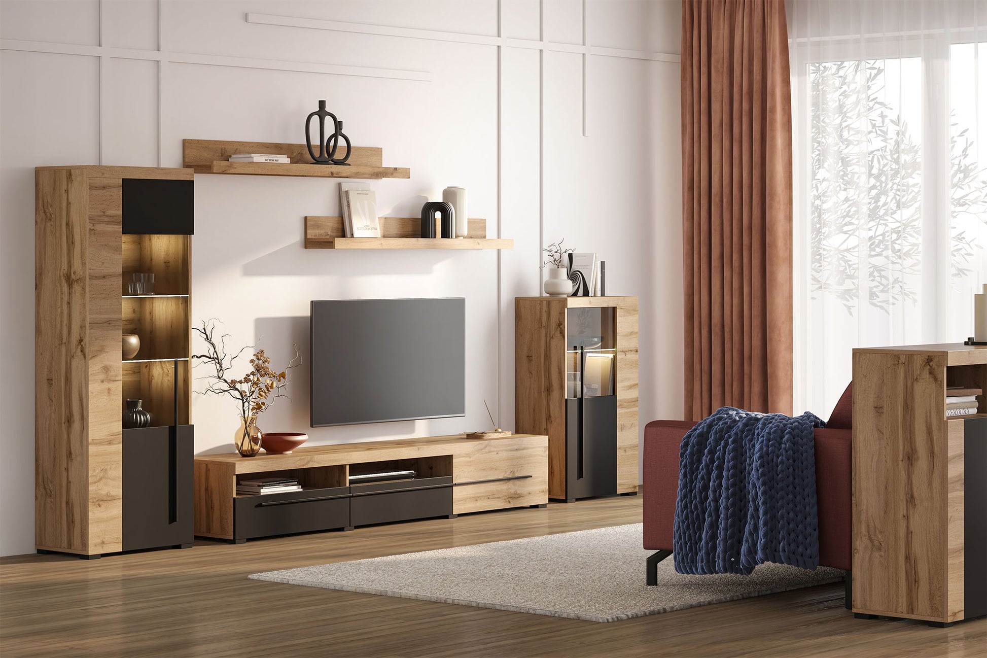 Rogos piedāvā funkcionālas un stilīgas sienas vienības, kurās ir vieta televizoram, plaukti grāmatām un dekorācijām, kā arī slēgti uzglabāšanas skapji.