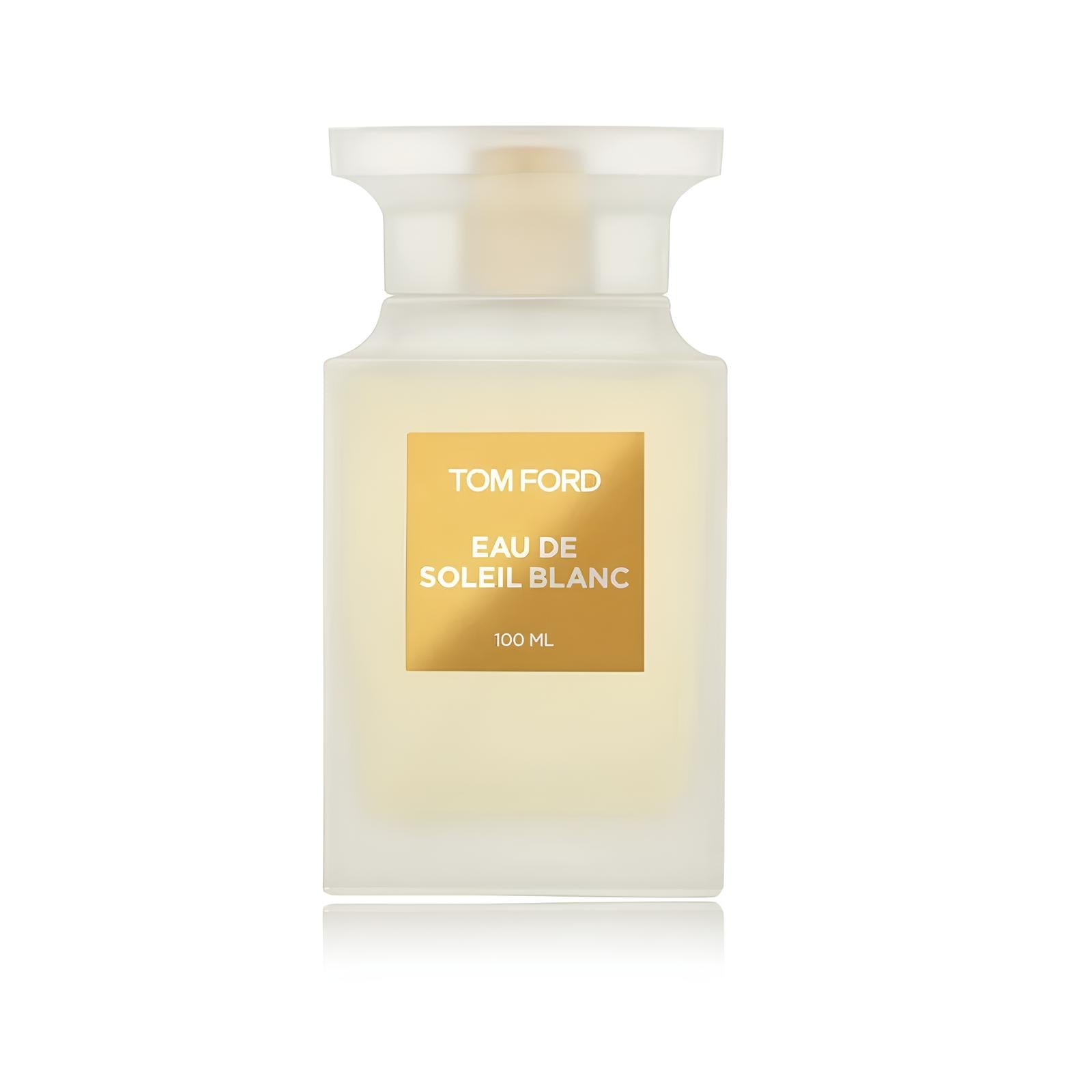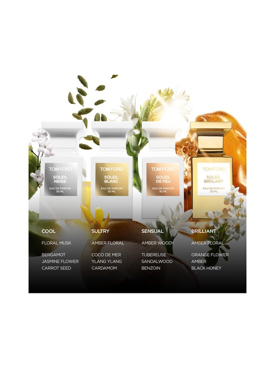 Aromāts atveras ar svaigām citrusaugļu un papildinošu garšvielu notīm. Apkārt atsvaidzinošajai rūgtā apelsīna ēteriskās eļļas un lapu esencei, pikantā apelsīna, citrona un bergamotes akordi izstaro svaigu, dzīvīgu mirdzumu. To papildina pistācijas, kardamons, rozā pipari un ķimenes ar to patīkami pikantajām notīm. Tom Ford Soleil Blanc sirdī slēpjas spilgti ziedu aromāti, kuru pušķis reibina ar tuberozes, smaržīgās kanangas un jasmīna jutekliskumu. To saldās notis papildina galbanum ferula zaļums un Tunisijas apelsīnu ziedu vieglā smarža. Visbeidzot, kompozīcija noslēdzas ar salda kokosrieksta un vaniļas kombināciju, kurā izkūst aromātisko tonga pupiņu, benzoīna un saulainā dzintara jutekliskās notis.